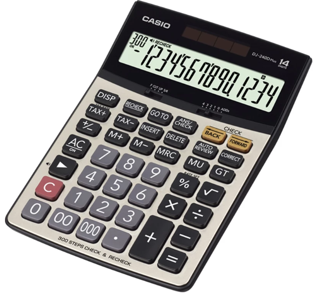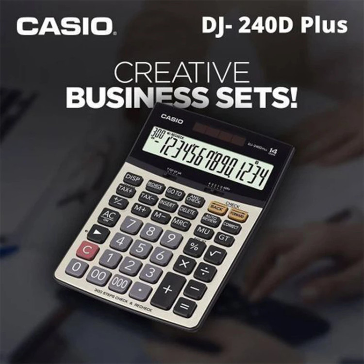 شرکت کاسیو یکی از نامهای آشنا در تولید محصولات الکترونیک مخصوصاً درزمینهی ساعت و ماشینحساب است. ماشینحساب DJ-240D Plus درواقع مدل پیشرفتهتر دستگاه DJ-240D است که در آن به امکانات دستگاه افزوده شده است. این ماشینحساب که در دستهی مدلهای رومیزی قرار میگیرد قادر است تا 14 عدد را بر روی صفحهنمایش بزرگ خود نمایش دهد و ازاینرو برای انجام محاسبات بزرگتر با اعداد بیشتر مناسبتر است. برق مصرفی دستگاه همانند دیگر مدلهای کاسیو از دو منبع باتری و پنل خورشیدی تأمین میشود و درصورتیکه در محیطهایی با نور کافی باشید به باتری نیازی نخواهید داشت. شاید بتوان گفت که مهمترین قابلیت این مدل توانایی دستگاه برای کنترل محاسبات انجام شده تا 300 مرحله است که در صورت طولانی بودن محاسبات امری بسیار مهم است زیرا احتمال اشتباه در محاسبات طولانی بسیار بالاست. برای کنترل محاسبت با این قابلیت میتوانید به 2 صورت مرور دستی و یا اتوماتیک عمل کنید. این مدل را میتوان مناسب استفاده برای اهداف تجاری و فروشگاهی در نظر گرفت و ازاینرو محاسبهی مالیات هم در آن تعبیه شده است.